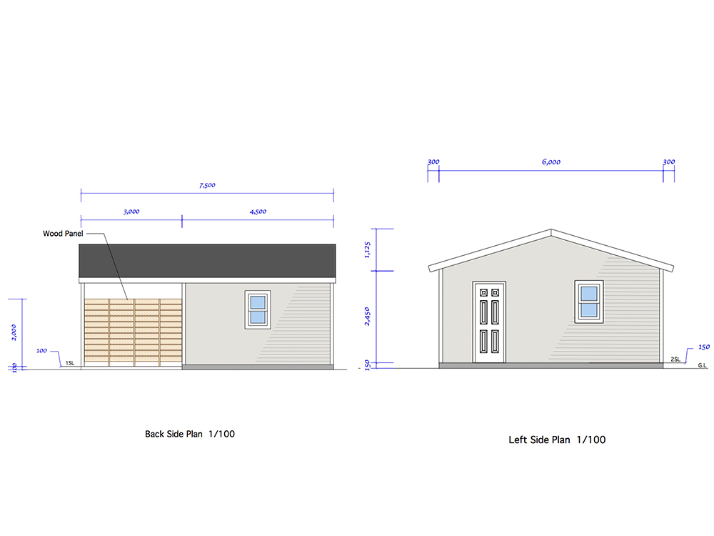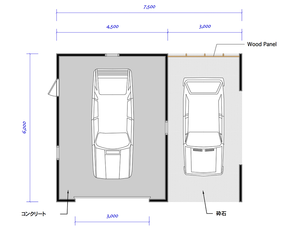 今回パースでご紹介しているサイズは全て7.5×6.0mです。以下写真とは異なりますが、カーポート付き木造ガレージのイメージ写真としてご覧下さい。