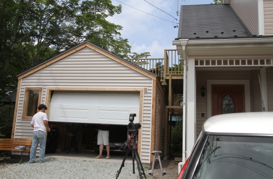 ガレージの背面、屋根勾配を緩くして、デッキを構築しました。ガレージの奥行きは7.0mです。