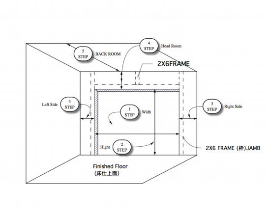 - 仕上がった開口部の幅をx計ります。構造工事が終わった段階ではまだ正しい開口幅ではありません、完成時にどの程度開口の幅が縮小されるのか、確認してください。開口部の周りには、破線で示した部分に2X6材を設置する必要があります。