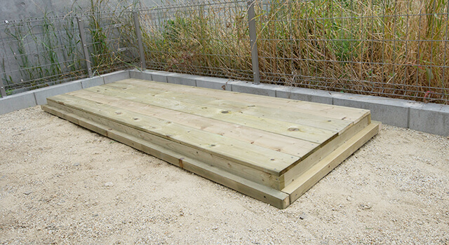 物置のパネルと地面を杭で固定する方法で、床部分に砕石を敷きます。他の床タイプに比べ安価に施工でき、屋内で水も使用できます。