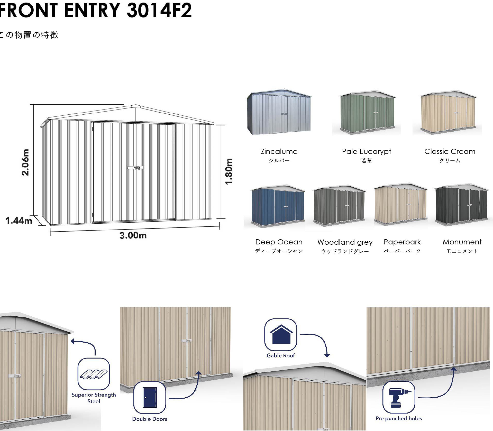 ユーロ物置 ® は基本的に船便でコンテナを入荷をしています。オーストラリアから日本へ最短で輸入できるルートを確保しています。船便の場合、天候や経由ルートの都合で稀に船長の独断でルート変更 をする場合があり、これをカントリーリスクと言います。カントリーリスクによる日本入荷日の遅延が発生する場合があ りますので、ご予約商品をお買い求めの際は十分にご理解ください。また、ご入金はご予約時にお願いします。ご入金をもってご予約とさせて頂きます。