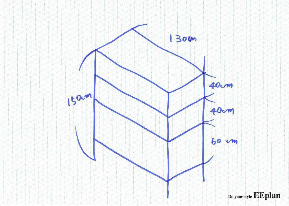 - 下記リンクからダウンロードできるアイソメ用方眼紙に希望の大きさの棚(間口、奥行、高さ)を記入する。フリーハンドでOK。ダウンロードしても、印刷して手書きしてもOK。