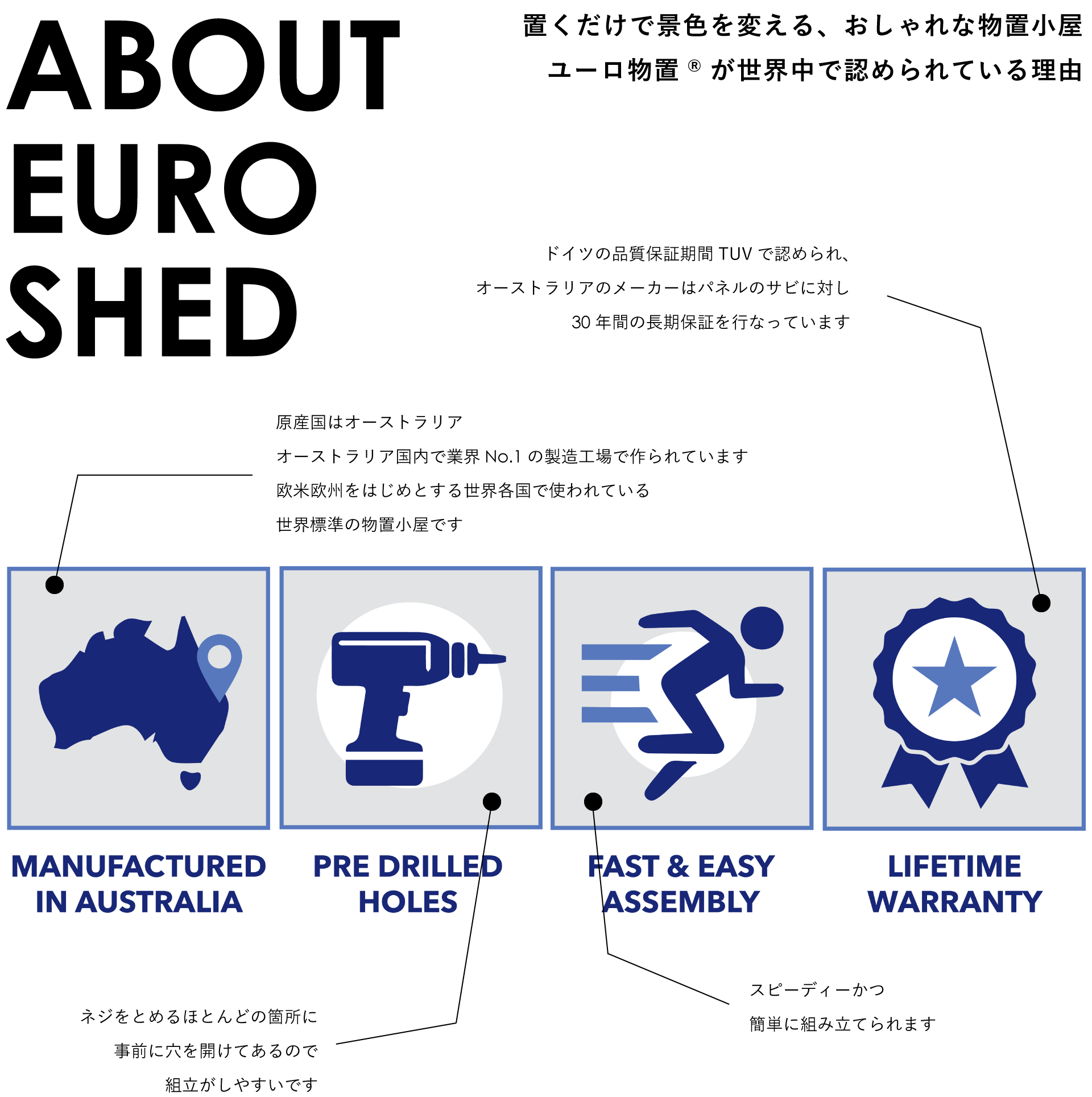 オーストラリアから輸入されたユーロ物置®︎は、そのままお客様の元へ配送されている訳ではありません。例えば日本の皆様へは、ステンレスビスや海外製品でありながら日本の法律を満たすことのできる「令40条キット」を日本独自で標準付属しています。また物置の基礎部分も雨水の侵入を防ぐために、日本独自の凸状の基礎を開発しご提案しています。その他、ご購入後アンケートに寄せられる様々なリクエストを真摯に受け止め、海外製品でありながら本当に日本の生活に馴染む商品にできるよう企業努力を続けています。