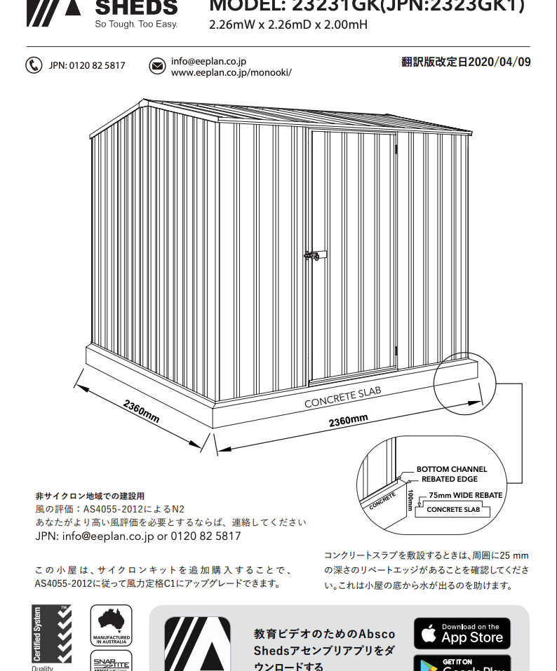 | セット内容 | 本体組立用ビス、SUSビス、英字組立説明書、コンクリート用アンカーキット、令40条キット | |||||