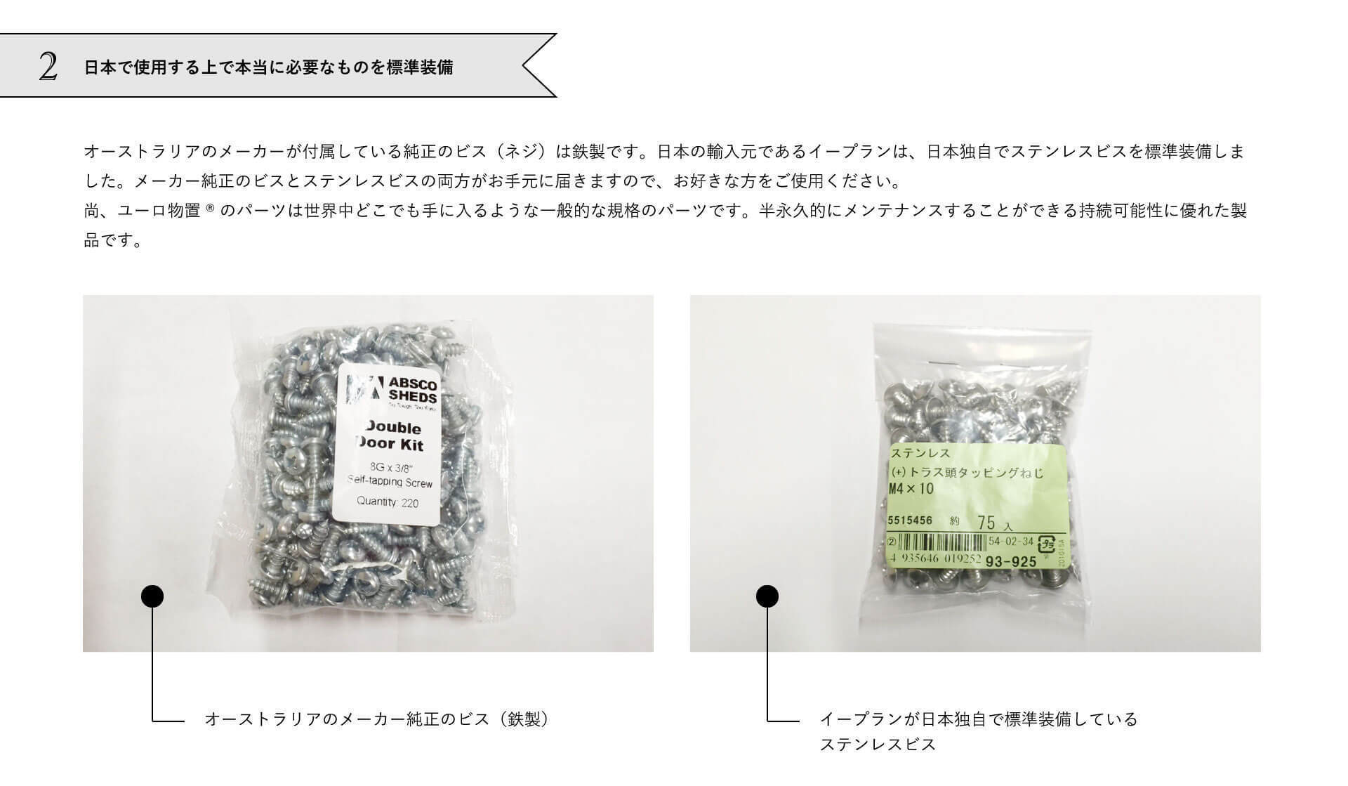 オーストラリアから輸入されたユーロ物置®︎は、そのままお客様の元へ配送されている訳ではありません。例えば日本の皆様へは、ステンレスビスや海外製品でありながら日本の法律を満たすことのできる「令40条キット」を日本独自で標準付属しています。また物置の基礎部分も雨水の侵入を防ぐために、日本独自の凸状の基礎を開発しご提案しています。その他、ご購入後アンケートに寄せられる様々なリクエストを真摯に受け止め、海外製品でありながら本当に日本の生活に馴染む商品にできるよう企業努力を続けています。