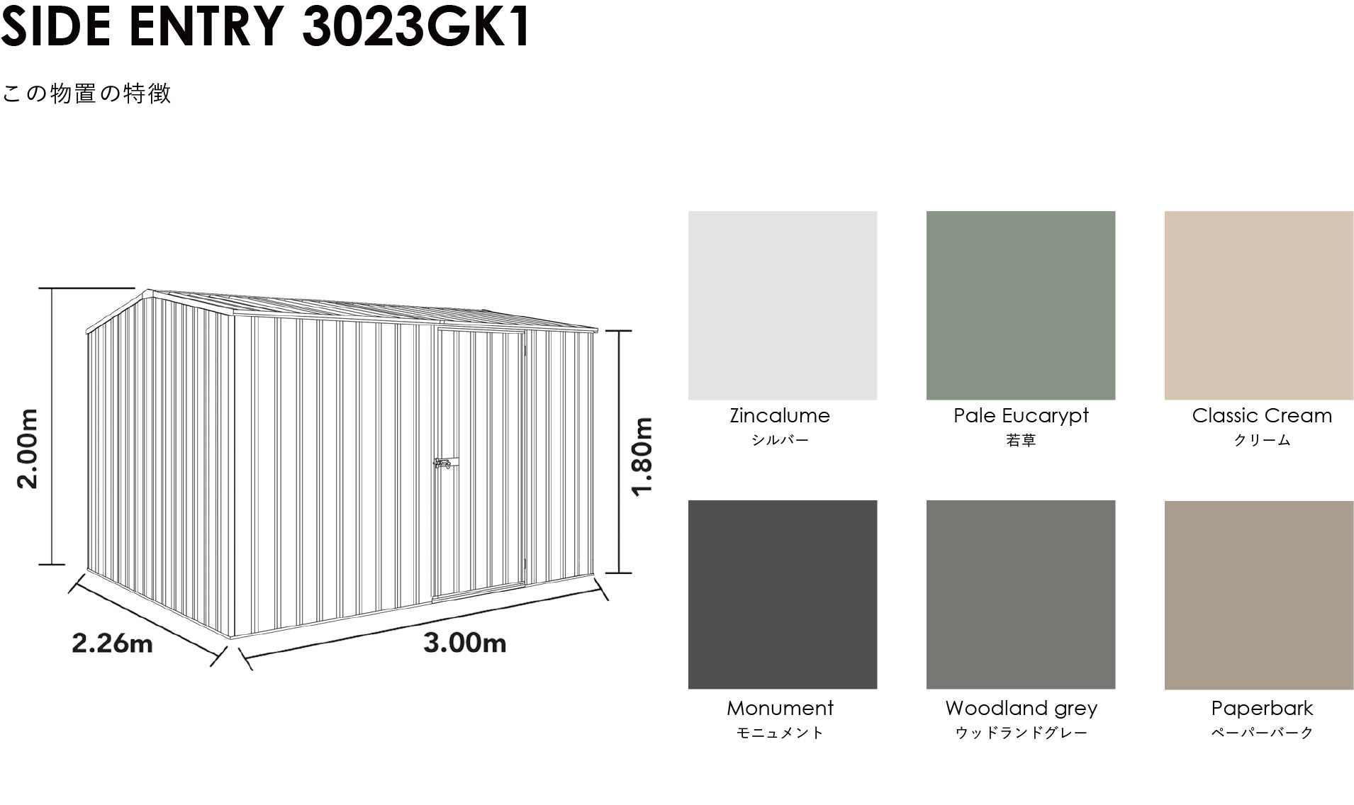 | サイズ | 間口:3000mm 奥行:2260mm 軒高:1800mm 最高高:2100mm 開口寸法:約W750mm×H1725mm ドア枚数:1枚 |
