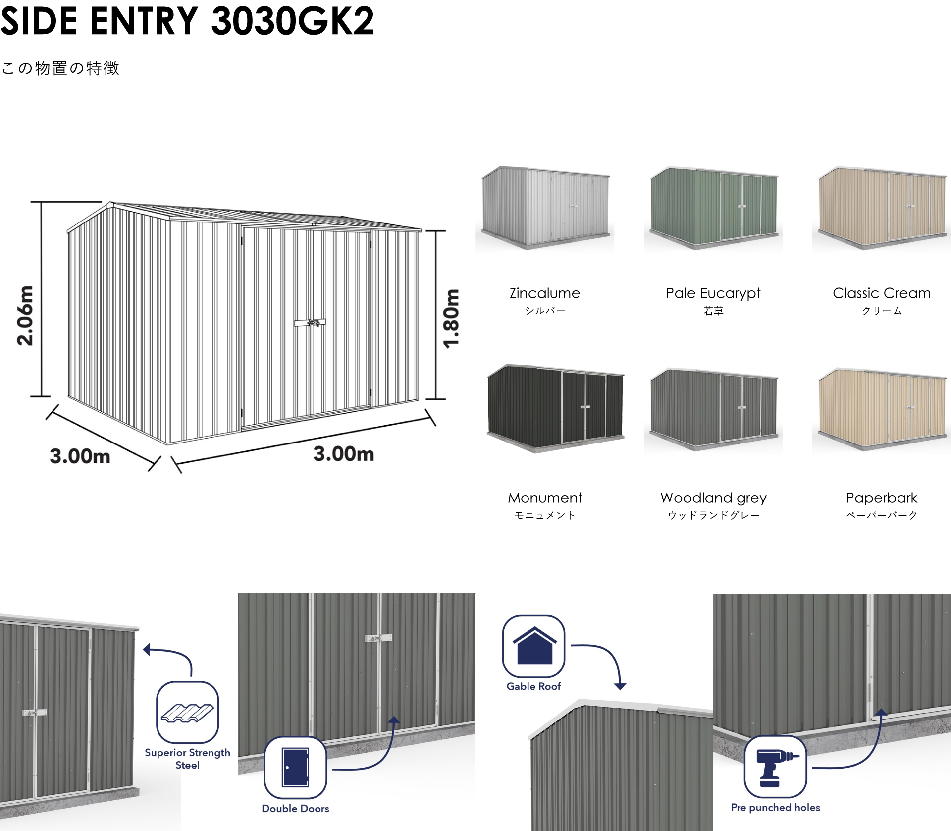 | サイズ | 間口:3000mm 奥行:3000mm 軒高:1800mm 最高高:2100mm 開口寸法:約W750mm×H1725mm ドア枚数:2枚 |