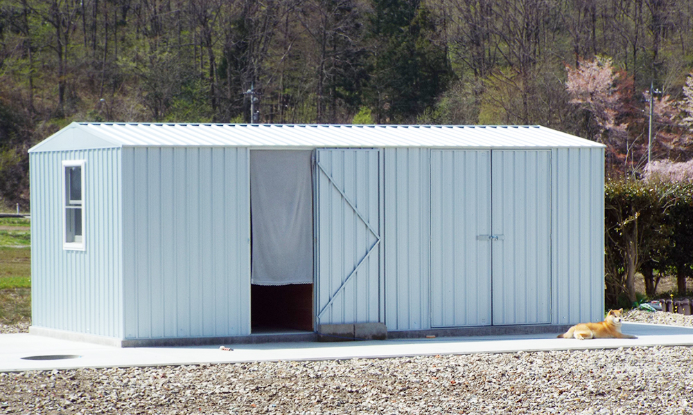 ワークショップシリーズの用途は様々で、作業部屋、小屋、ガレージ、倉庫、趣味空間など本当に様々な用途でご愛用されております。今回取材させて頂いたDesign Store様は愛犬の小屋やお仕事で使用する資料などを保管するスペースとしてご愛用されておりました。素晴らしいアイディアですね。向かって左側の1枚扉の方がわんちゃんのお部屋、右側の2枚扉の観音開きの方がお仕事の物や自転車などを収納されているそうです。わんちゃんも自由に日向ぼっこしたり、お部屋で休んだり。とても幸せそうでした。