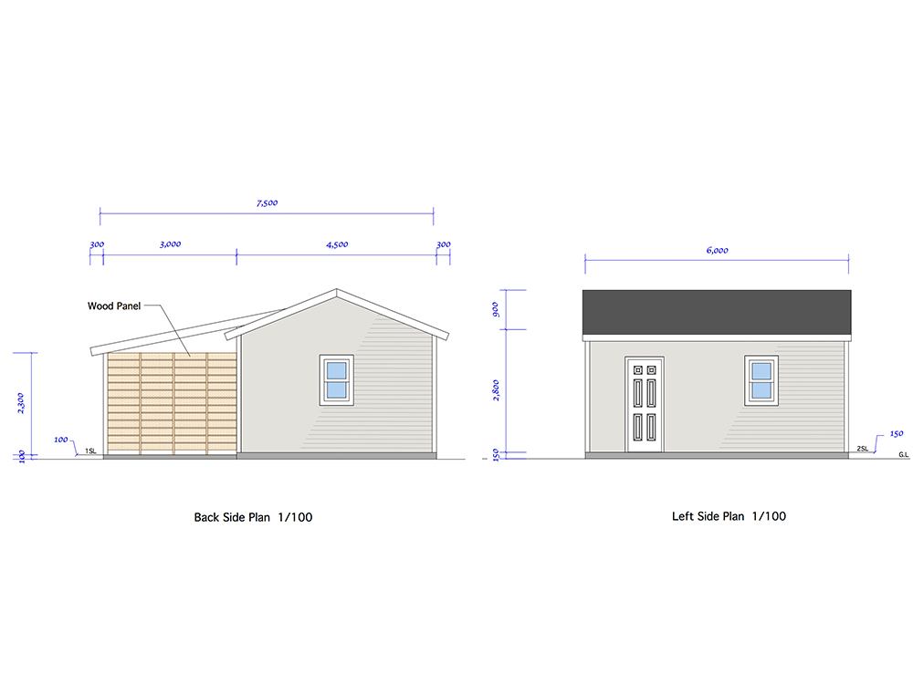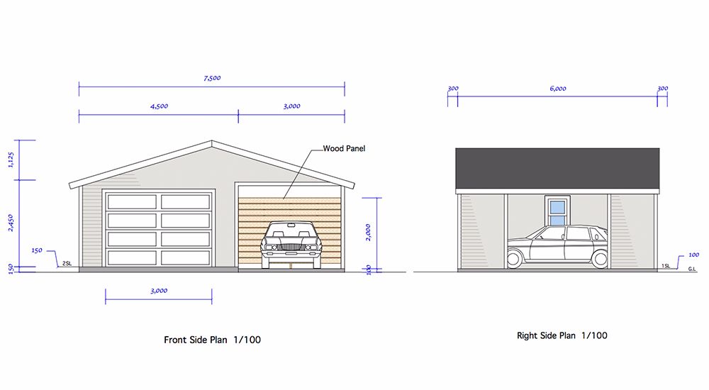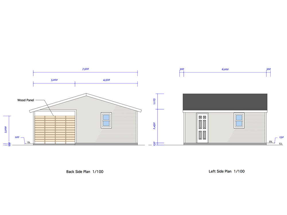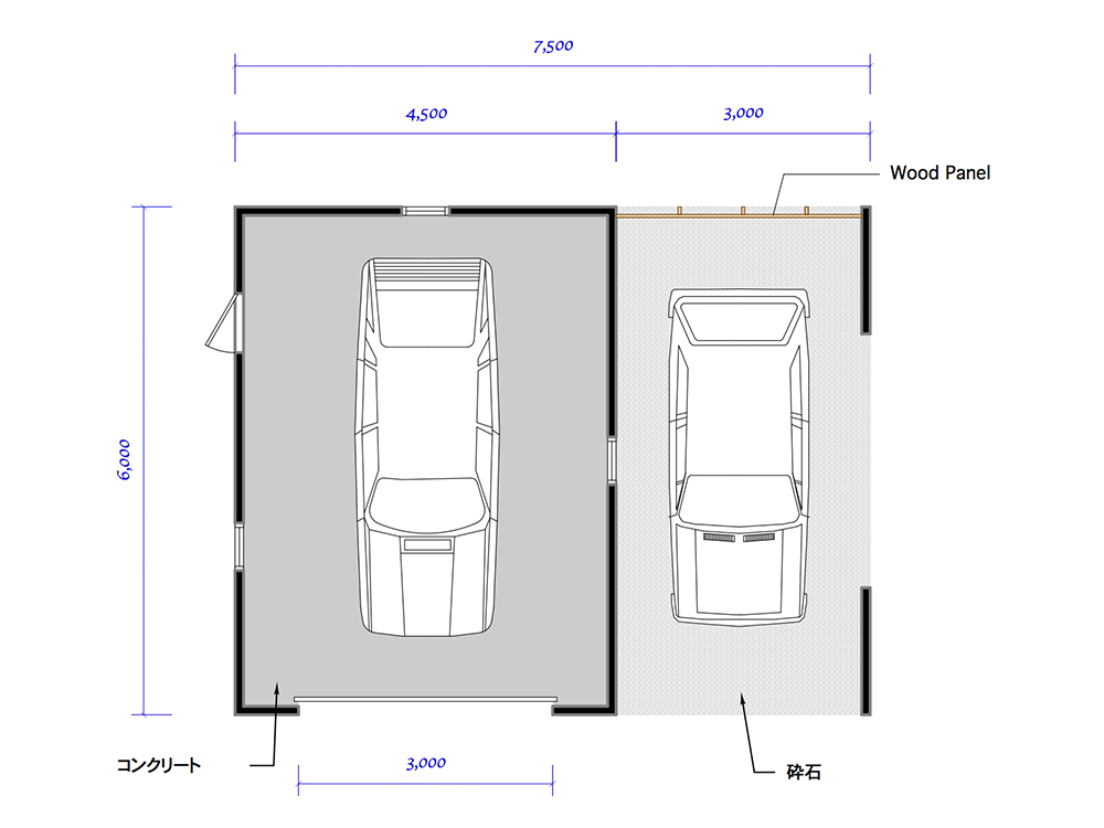 今回パースでご紹介しているサイズは全て7.5×6.0mです。以下写真とは異なりますが、カーポート付き木造ガレージのイメージ写真としてご覧下さい。